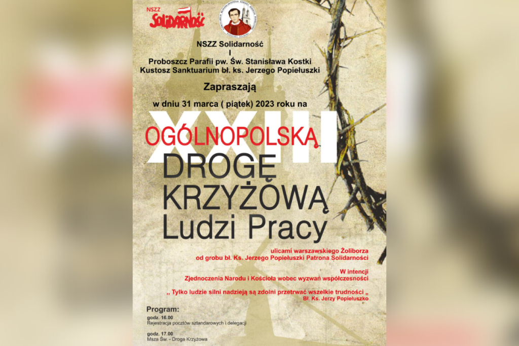 Materiały organizatoraW piątek 31 marca ulicami Żoliborza przejdzie XXIII Ogólnopolska Droga Krzyżowa Ludzi Pracy. Jej hasłem będą słowa bł. ks. Jerzego Popiełuszki: “Tylko ludzie silni nadzieją są zdolni przetrwać wszelkie trudności”. Procesja pokutna tradycyjnie wyruszy z kościoła świętego Stanisława Koski, od grobu błogosławionego Księdza Jerzego Popiełuszki, patrona Solidarności, przyjaciela i orędownika robotników.