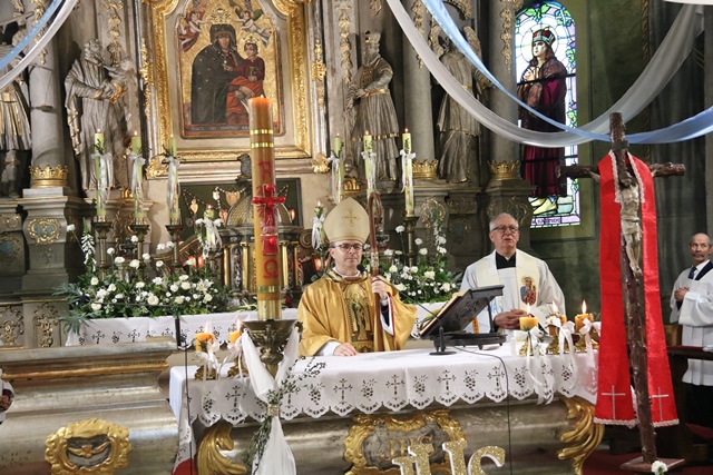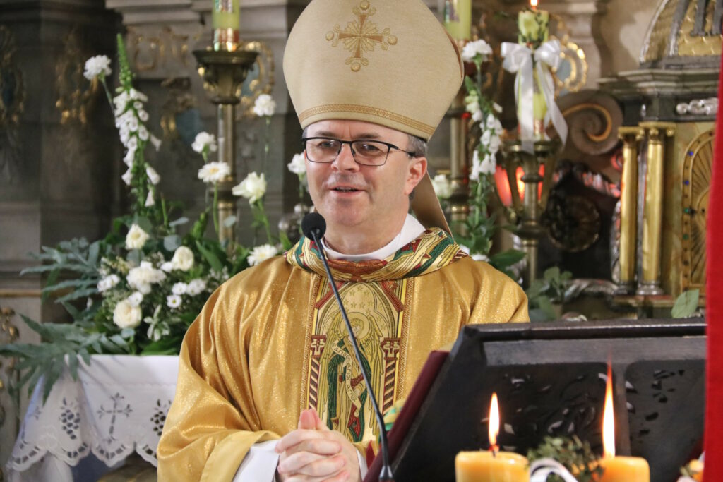 Fot. Ewa Kotowska-Rasiak/KAI– Dzisiaj warto zadać sobie pytanie: „czy moje życie, które tutaj podejmuję prowadzi mnie do nieba, czy bardziej mnie od tego nieba oddala? – mówił biskup kaliski Damian Bryl w Żegocinie z okazji VIII Pielgrzymki Chórów i Orkiestr Południowej Wielkopolski do Sanktuarium Matki Bożej Żegocińskiej.