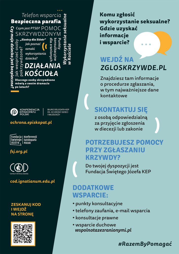 – Chcemy, aby nasza akcja trafiła do możliwie największej liczby odbiorców, dlatego do każdej kurii diecezjalnej w Polsce zostały przekazane specjalnie przygotowane plakaty, które w przystępny, informacyjny sposób pokazują, że w Kościele działa system przyjęcia osoby skrzywdzonej, otoczenia jej wsparciem i niezbędną pomocą i że każdy potrzebujący może z takiego wsparcia skorzystać. Delegat KEP ds. ochrony dzieci i młodzieży abp Wojciech Polak przesłał też list do wszystkich biskupów diecezjalnych z prośbą, by przekazali plakaty do wszystkich parafii w diecezji. Bardzo liczymy na to, że księża w całej Polsce przyłączą się do tej akcji i wywieszą plakaty w gablotach przykościelnych. Z góry serdecznie dziękuję za współpracę i pomoc – podkreśla ks. Piotr Studnicki, kierownik Biura Delegata KEP ds. ochrony dzieci i młodzieży.