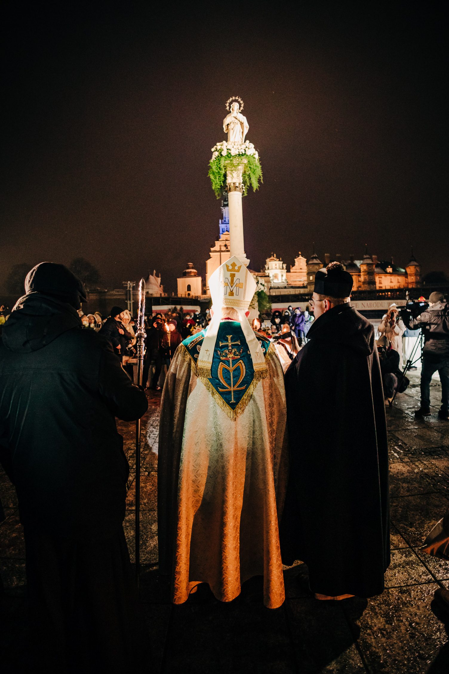 Fot. Piotr Tumidajski– Oby nigdy w Ojczyźnie Jasnej Góry nie zabrakło światła nadziei – apelował abp Wacław Depo na Jasnej Górze podczas „Hołdu z kwiatów” w uroczystość Niepokalanego Poczęcia NMP. Metropolita częstochowski dokonał aktu zawierzenia Kościoła, Polski i świata Maryi. Zimno nie zniechęciło pielgrzymów i wiernych archidiecezji częstochowskiej zgromadzonych na jasnogórskim placu.