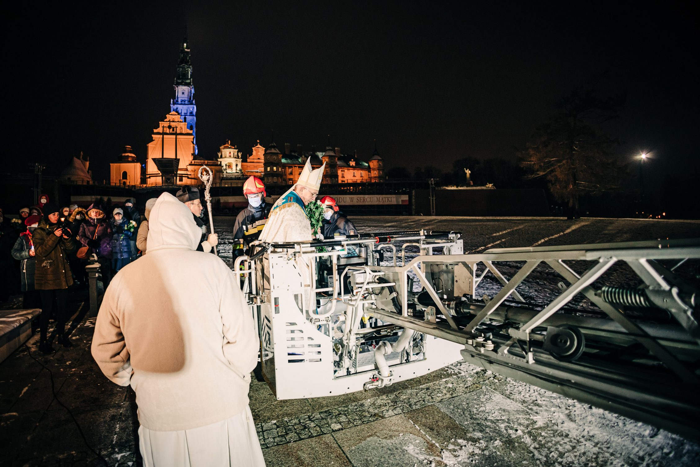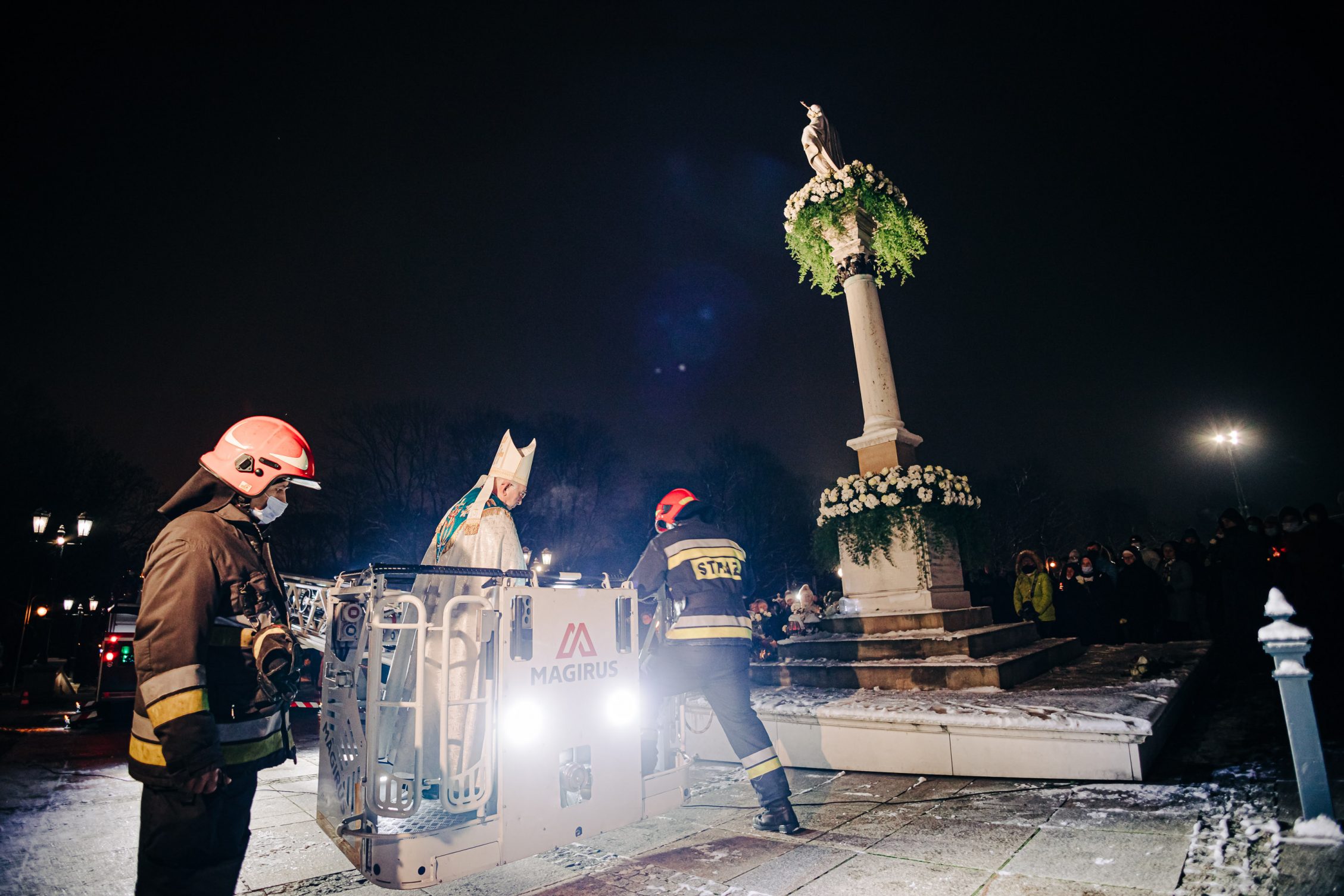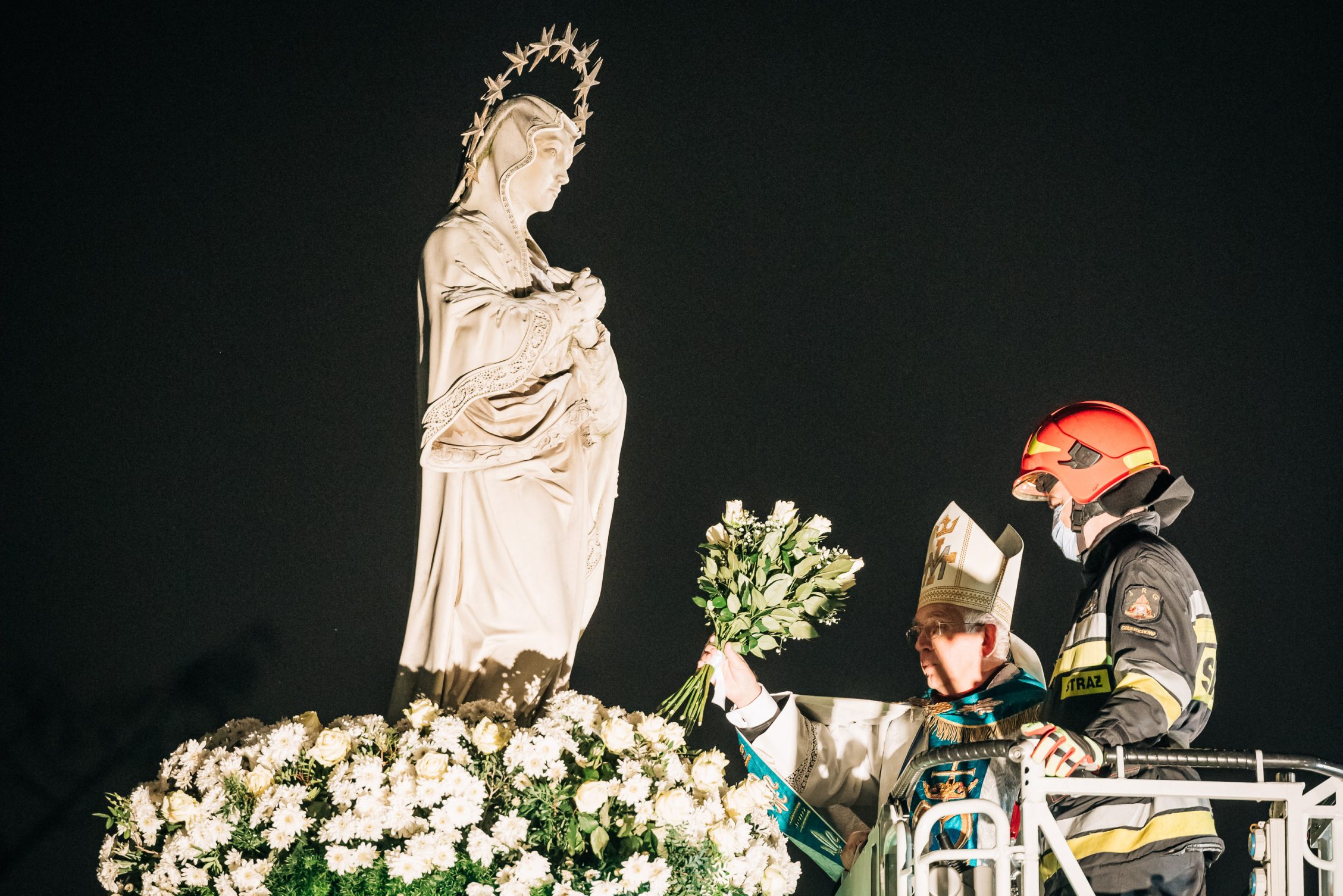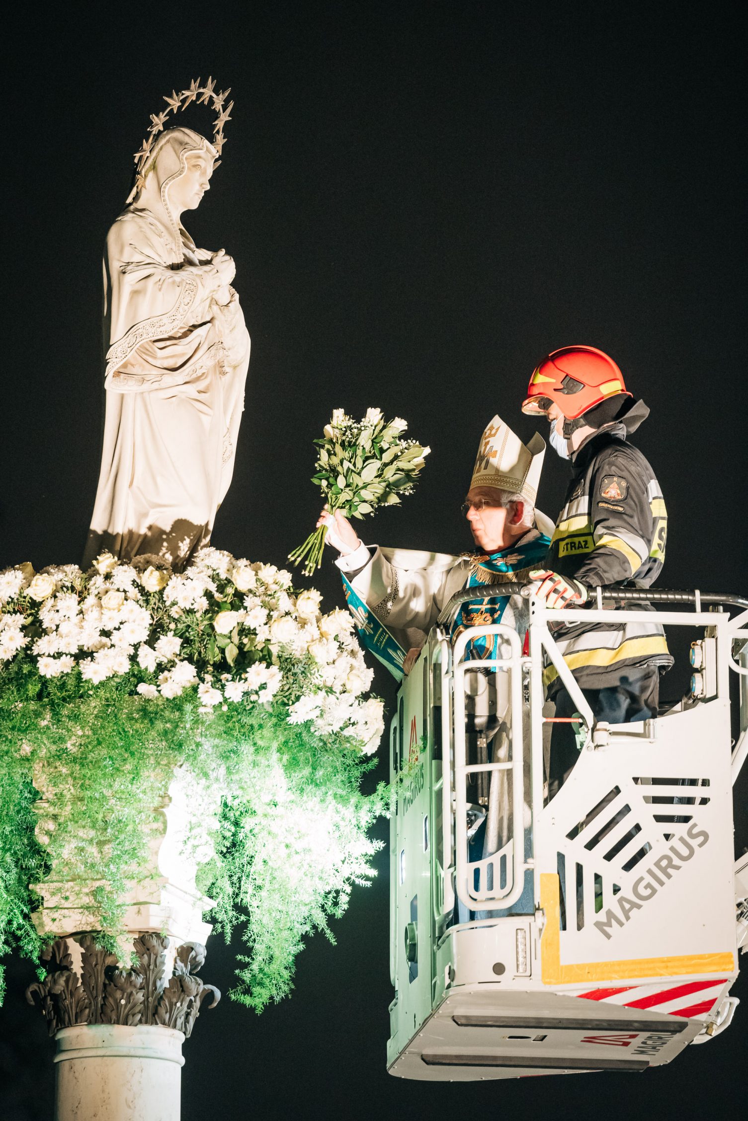 Główny celebrans na podnośniku wozu strażackiego przygotowanego przez Państwową Straż Pożarną w Częstochowie został uniesiony na wysokość figury Niepokalanej, gdzie złożył wiązankę z białych kwiatów.