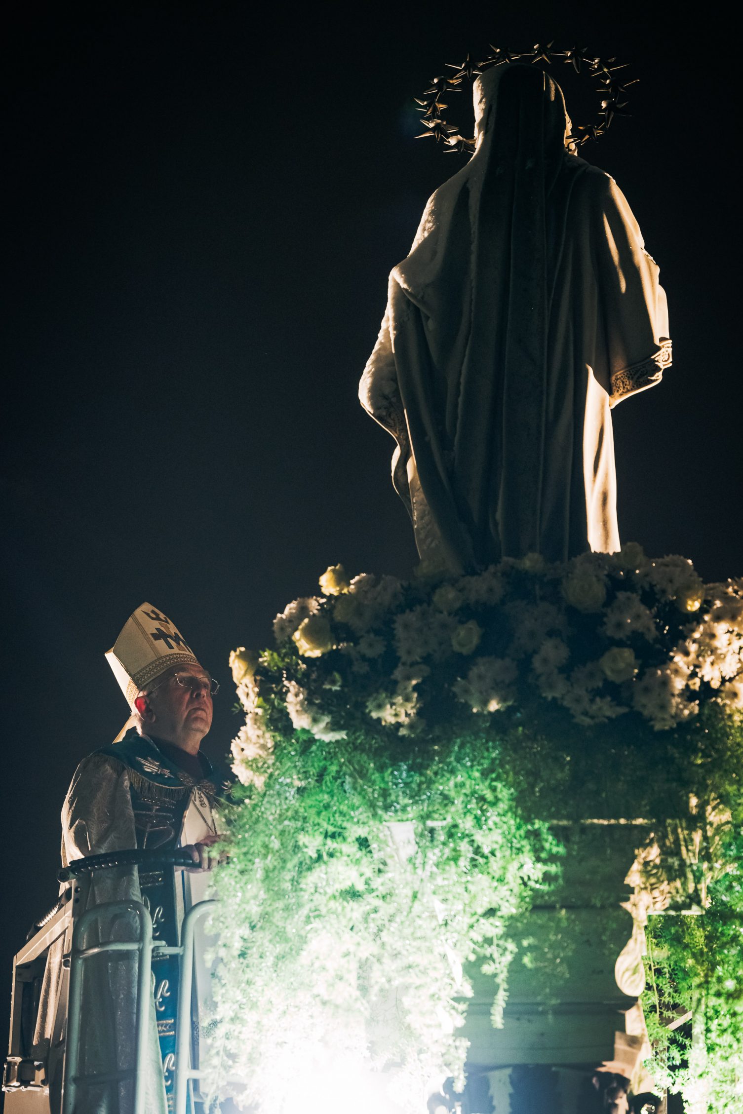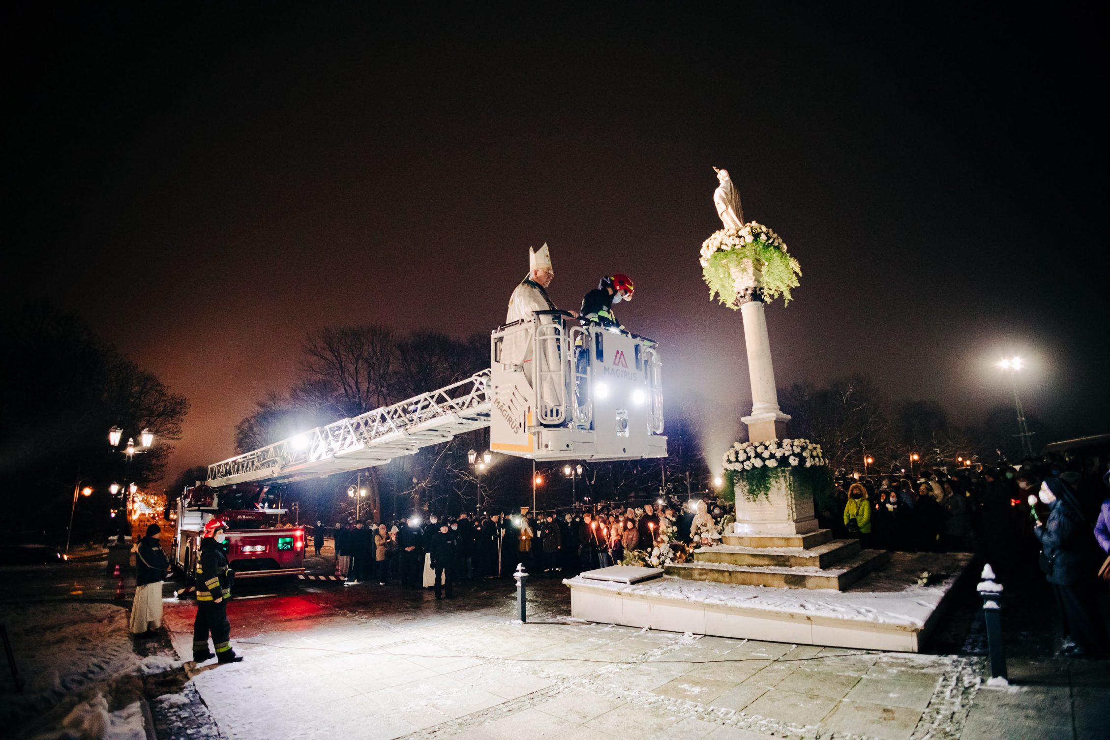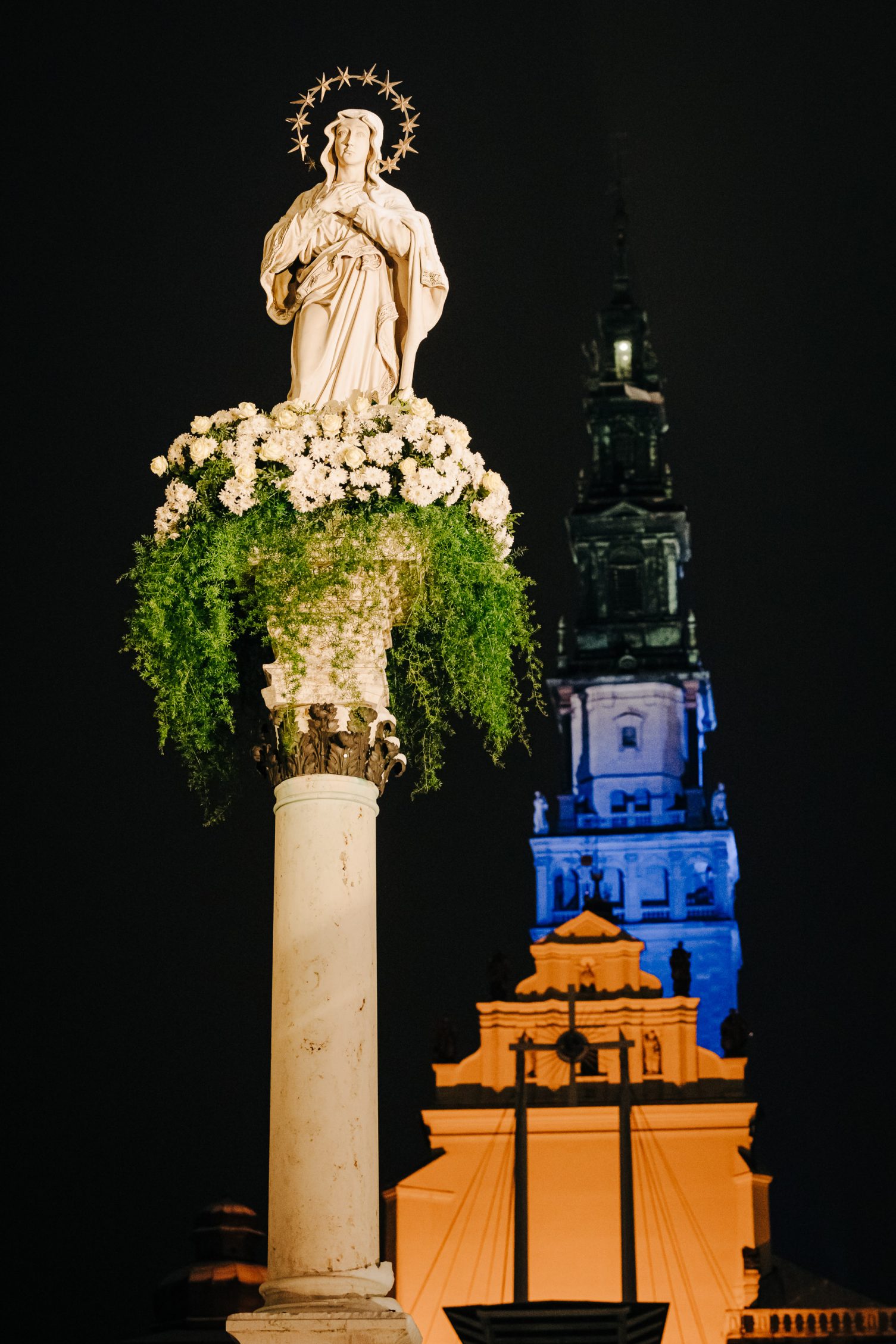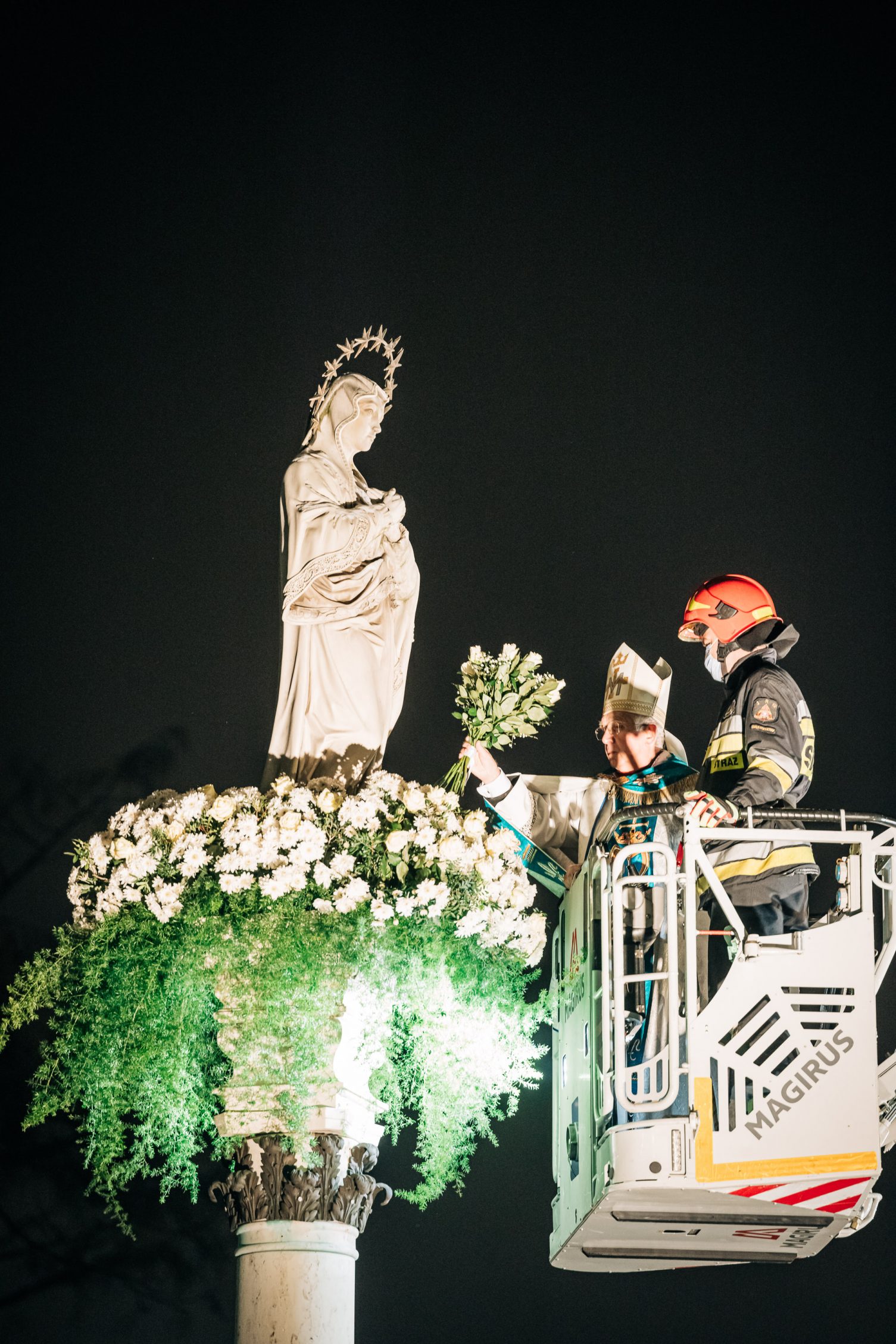 Główny celebrans na podnośniku wozu strażackiego przygotowanego przez Państwową Straż Pożarną w Częstochowie został uniesiony na wysokość figury Niepokalanej, gdzie złożył wiązankę z białych kwiatów.