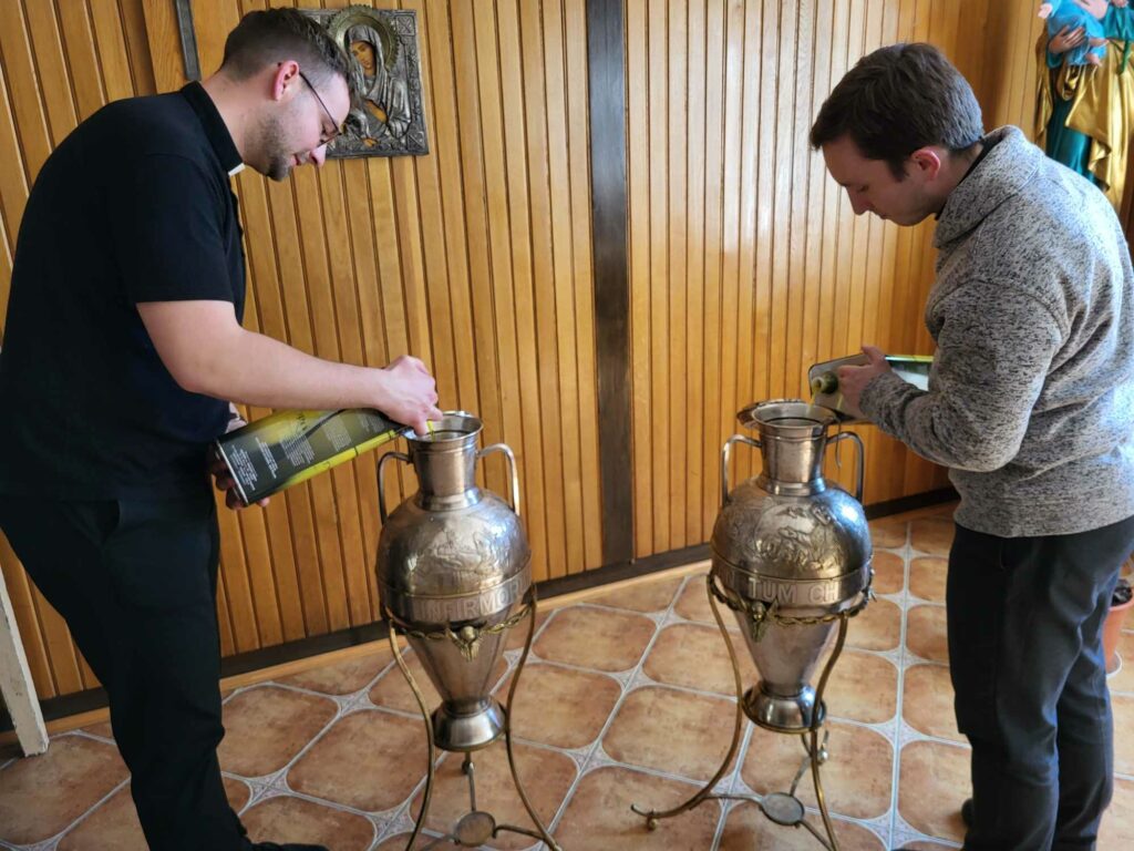 – Do przygotowania Olejów Świętych wykorzystujemy 40 litrów włoskiej oliwy z Oliwek, którą sprowadzamy prosto od producenta. Oliwę wlewamy do dwu stągwi wykorzystywanych w liturgii. – tłumaczy ks. Hubert Kempiński – ceremoniarz biskupi.