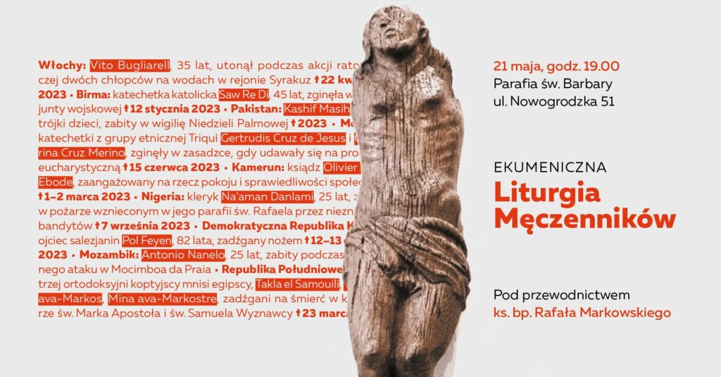Pomagając najuboższym, pielęgnując chorych lub po prostu idąc do kościoła – w XXI w. chrześcijanie wciąż oddają życie za swoją wiarę. Świadectwo ich wierności Ewangelii aż do przelania krwi przypomnieć chce Wspólnota Sant’Egidio podczas Ekumenicznej Liturgii Męczenników, która odbędzie się we wtorek 21 maja o godz. 19.00 w parafii św. Barbary przy ul. Nowogrodzkiej 51 w Warszawie. Modlitwie przewodniczyć będzie bp Rafał Markowski.