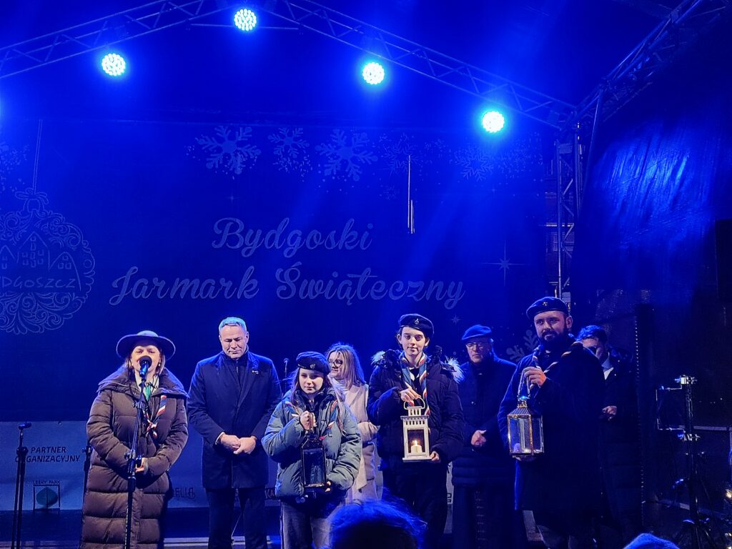 Organizator podziękował biskupowi bydgoskiemu za wczorajszą wigilię dla potrzebujących, a na scenę zostali zaproszeni harcerze, którzy wręczyli przemawiającym Betlejemskie Światło Pokoju. – Dzisiaj przybywamy, by na ręce pani przewodniczącej, pana prezydenta, księdza infułata oraz mieszkańców Bydgoszczy złożyć życzenia z przesłaniem, by czynić dobro – mówili harcerze.